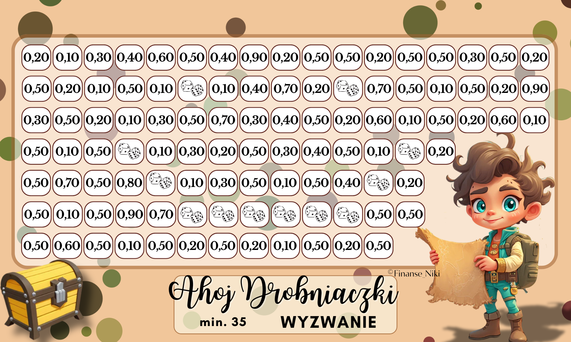 Zestaw 4 wyzwań oszczędnościowych to świetna zabawa, która pomoże najmłodszym nauczyć się zarządzać swoimi finansami w kreatywny sposób! Każde z wyzwań jest inne, ale wszystkie łączą naukę oszczędzania z radością i motywacją. Znajdziesz tutaj wyzwania, które pozwalają dzieciom śledzić postępy w odkładaniu pieniędzy na zaplanowane cele. Wartość pola można dostosować, a postępy zapisać na statusie finansowym na odwrocie planszy. W jednym z wyzwań kwoty do oszczędzenia są określone, ale losowanie wartości za pomocą kostek wprowadza element niespodzianki i zabawy.